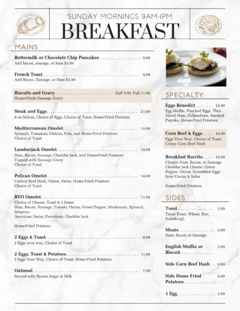 Welcome to The Pelican’s Nest where we build the best burger you’ve ever had. We start with the freshest ingredients and serve it just the way you like. If you’re in the mood for delicious seafood or savory steak, or luscious salads and decadent desserts, we’ve got you covered.