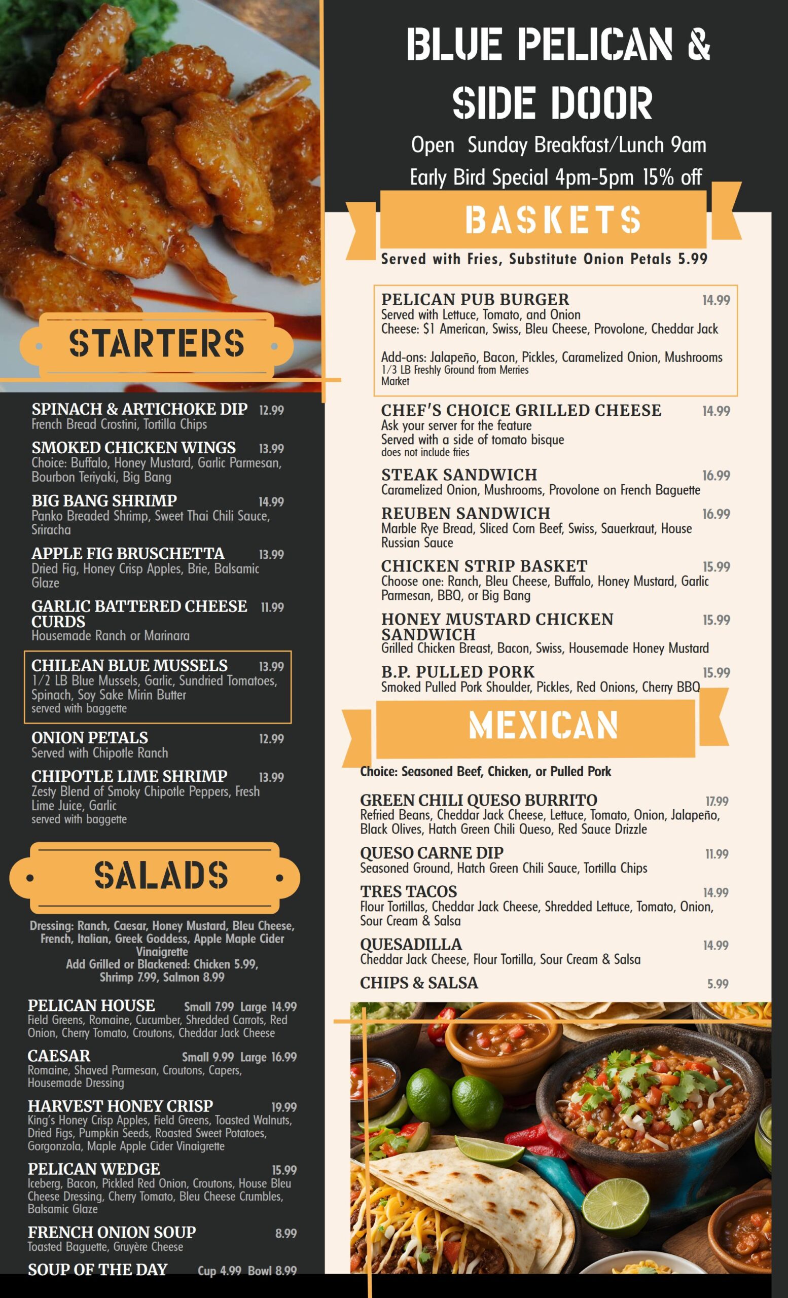 Our Seasoned chef is excited to present their vision to you and all our guests. Our caring and committed staff make sure you have a fantastic experience with us. American Pub menu, large outdoor seating area, the perfect restaurant for any occasion.