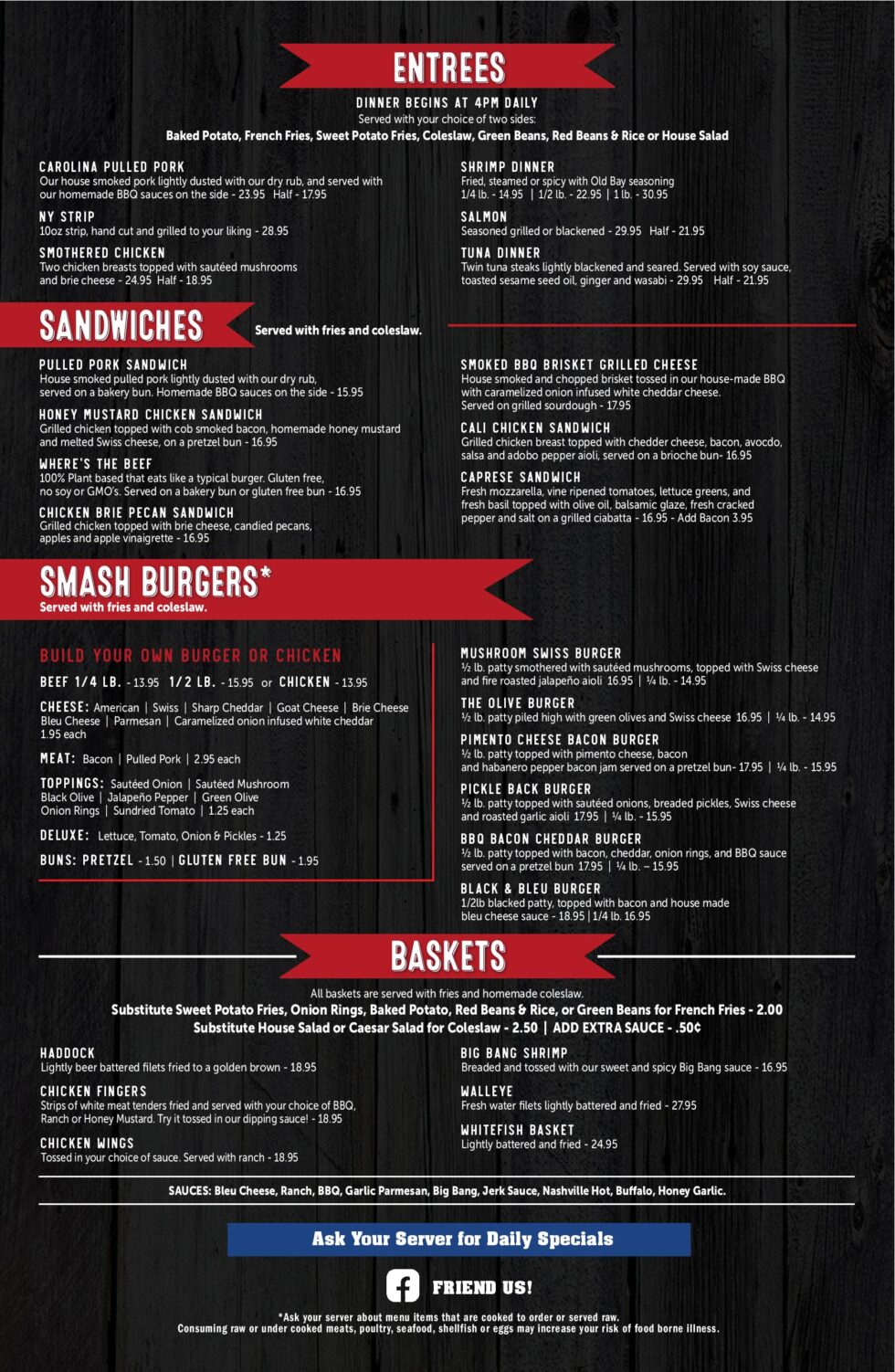 Full Pub Menu. Sports Bar atmosphere, game nights, daily specials, and more~